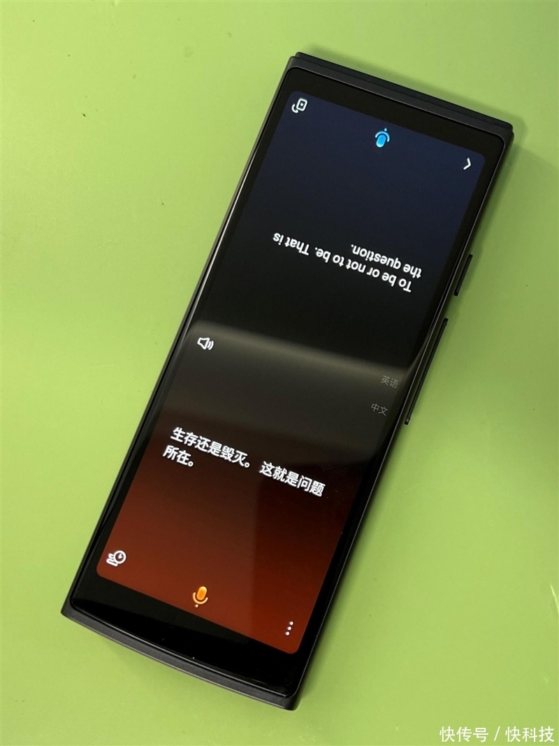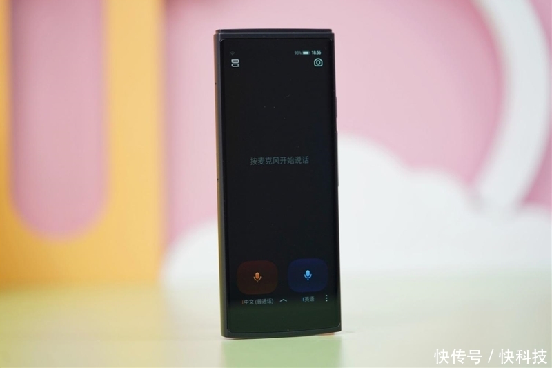 机身正面,颠覆了实体物理按键,采用触屏虚拟按键,最大程度地保留了大屏显示的完整度。在面对面的跨语言沟通时,还能切换双屏显示,自由选择屏幕朝向,这样双方都能很方便聚焦于自己面前的翻译信息。